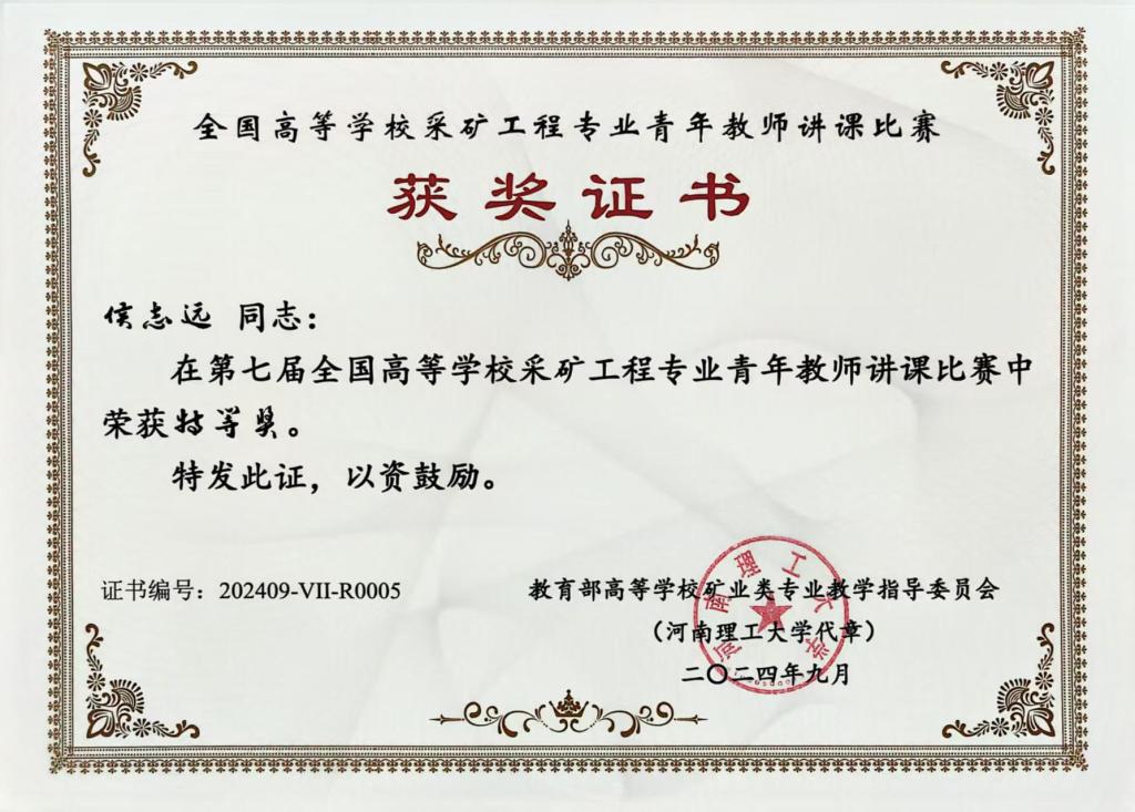 获批校级教学成果奖一等奖2项,中国煤炭行业教学成果奖二等奖2项;获批省级教改项目3项,省实验教学和教学实验室建设研究项目1项;在省级一流课程《矿山压力及岩层控制》的基础上,申报了国家级一流课程;《矿山压力及岩层控制》获校级课程思政示范课程及教学团队,并获校级课程思政优秀案例;《选矿学Ⅲ》成功在智慧树平台上线,实现了线上线下混合式授课,有3所学校采用平台授课;《龙江矿藏》课程获批中国地质学会精品地学研学课;出版教材3部。