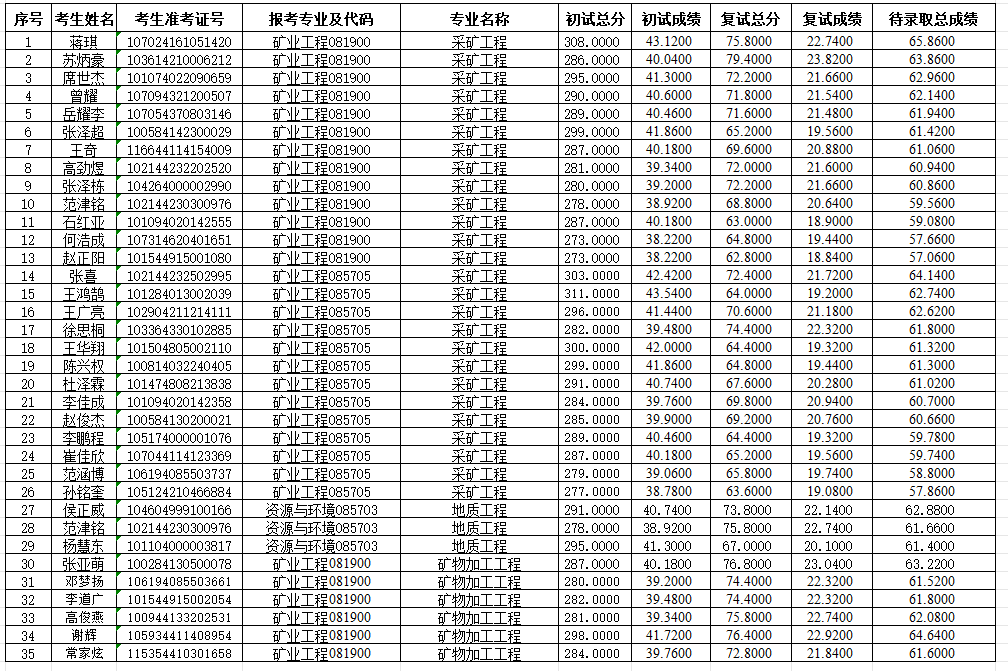beat365亚洲版官网2024年硕士研究生考试第一次调剂地质工程、矿物加工工程、采矿工程专业录取名单